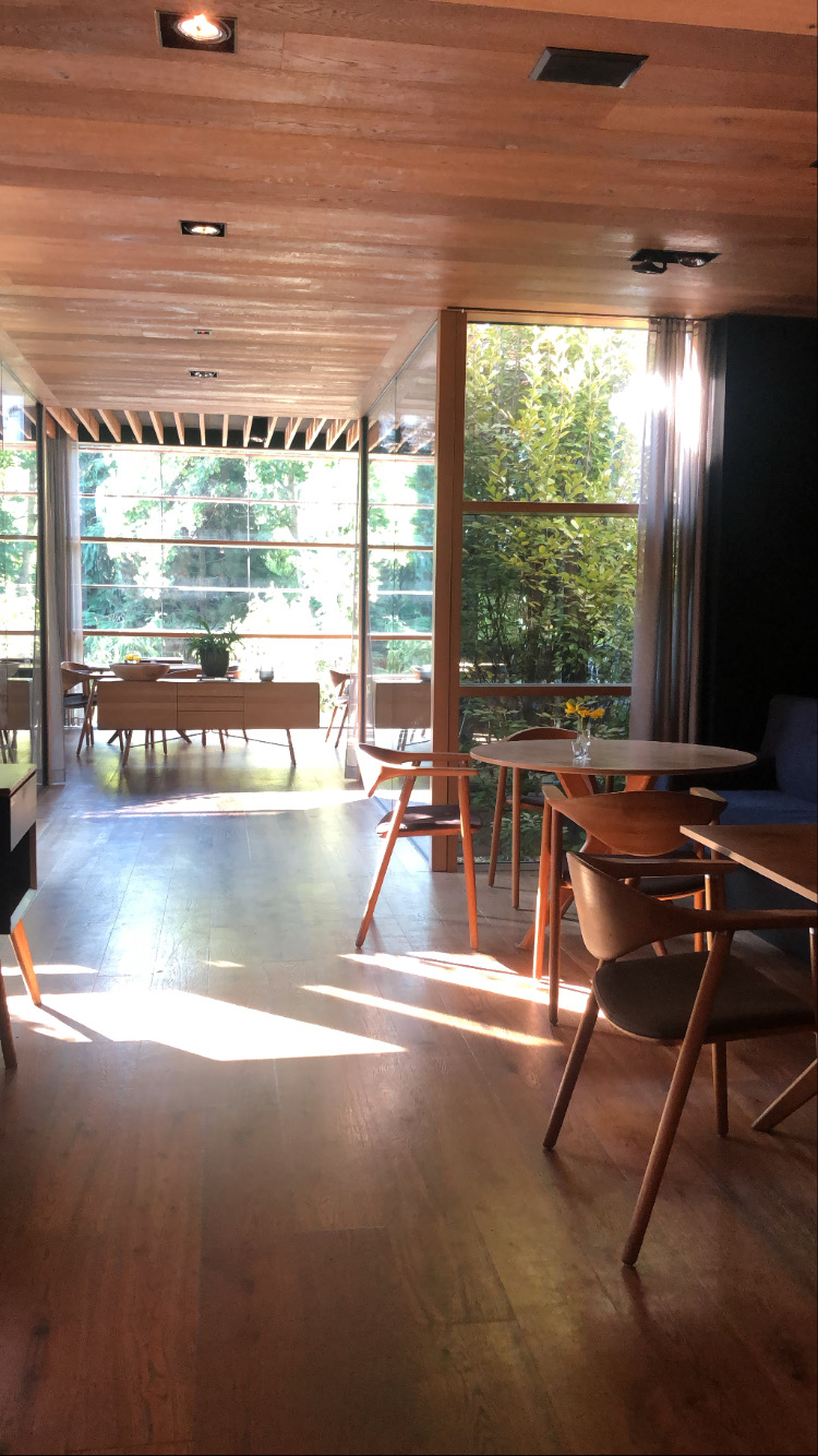 Eine vergleichbare Erinnerung will mir einfach nicht einfallen. Ein magischer Ort, den Hotelgästen vorbehalten. Der Schatten holt uns ein und wir trippeln durch den Wald in die hauseigene Saunalandschaft, wunderschön gestaltet mit offenem Blick auf die Berge gegenüber. Die Decken sind so kuschelig, die Düfte und Seifen so wertvoll. Man fühlt sich willkommen, aufgehoben, umsorgt wie zuletzt in der Kindheit. Das Abendessen schmeckt großartig, das Frühstück überrascht noch viel mehr. Neben dem Buffet darf man aus einer kleinen exklusiven Karte auswählen. Warmer Kokos-Porridge und eine Kimchi-Miso-Suppe sind nur zwei von vielen Highlights.